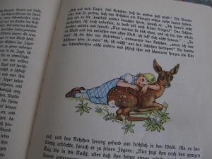 … einmal ein Schwesterchen, das weinte über das arme verwünschte Brüderchen, und das Rehlein weinte auch und saß so traurig neben ihm. …