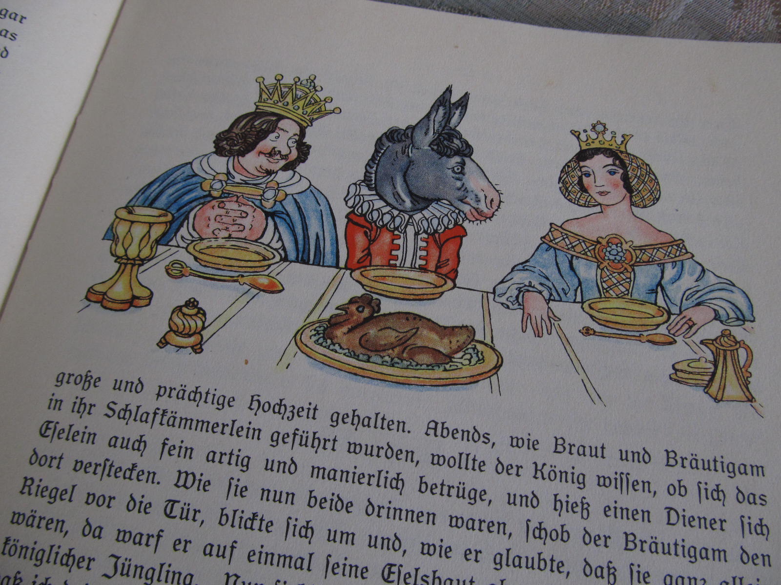… ein König und eine Königin, die waren reich und hatten alles was sie sich wünschten, nur keine Kinder. Endlich erfüllte Gott ihre Wünsche; als das Kind aber zur Welt kam, sah’s nicht aus wie ein Menschenkind, sondern war ein junges Eselein. …