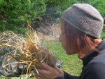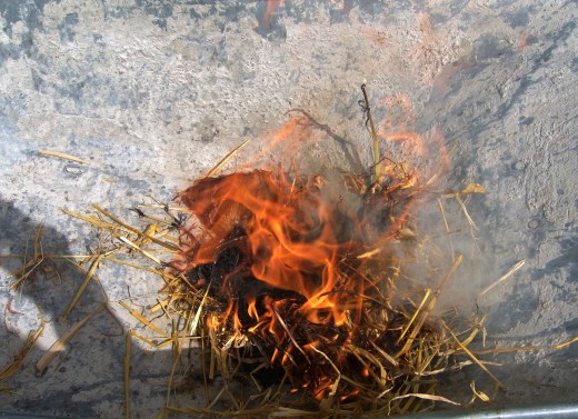 Holz auf Holz, mit einem bespannten Bogen unter Druck stark reiben, dann die Glut in ein Heu- Strohbett legen und fest anblasen. Wenn es glückt, hat man das Feuer geboren…